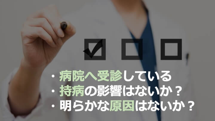 上記のように、明らかな怪我や病気の影響があるかをまずは確認しましょう。急性の怪我や病気の影響の場合は、診察のよる体の確認や医師の処方による薬での対処の方が問題を解決できることが多いです。